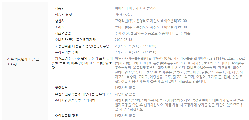 - 부원료 : 건조맥주효모, 어성초추출분말, 비오틴, 300달톤 저분자 콜라겐, 어골칼슘Q