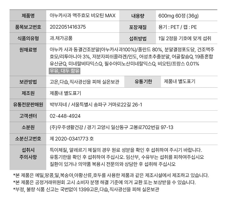 - 부원료 : 건조맥주효모, 어성초추출분말, 비오틴, 300달톤 저분자 콜라겐, 어골칼슘Q